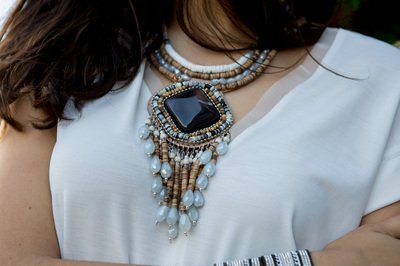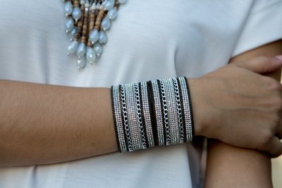 Una maxipulsera plateada con acabados de color negro, tendencia indiscutible para llevar sin anillos, maxicollar con una mezcla explosiva de colores y acabados entre estilo étnico y perlas que le dan un aspecto original y tendencia, el clutch bicolor blanco y plata con reloj compañero de esfera cuadrada terminado en strass.